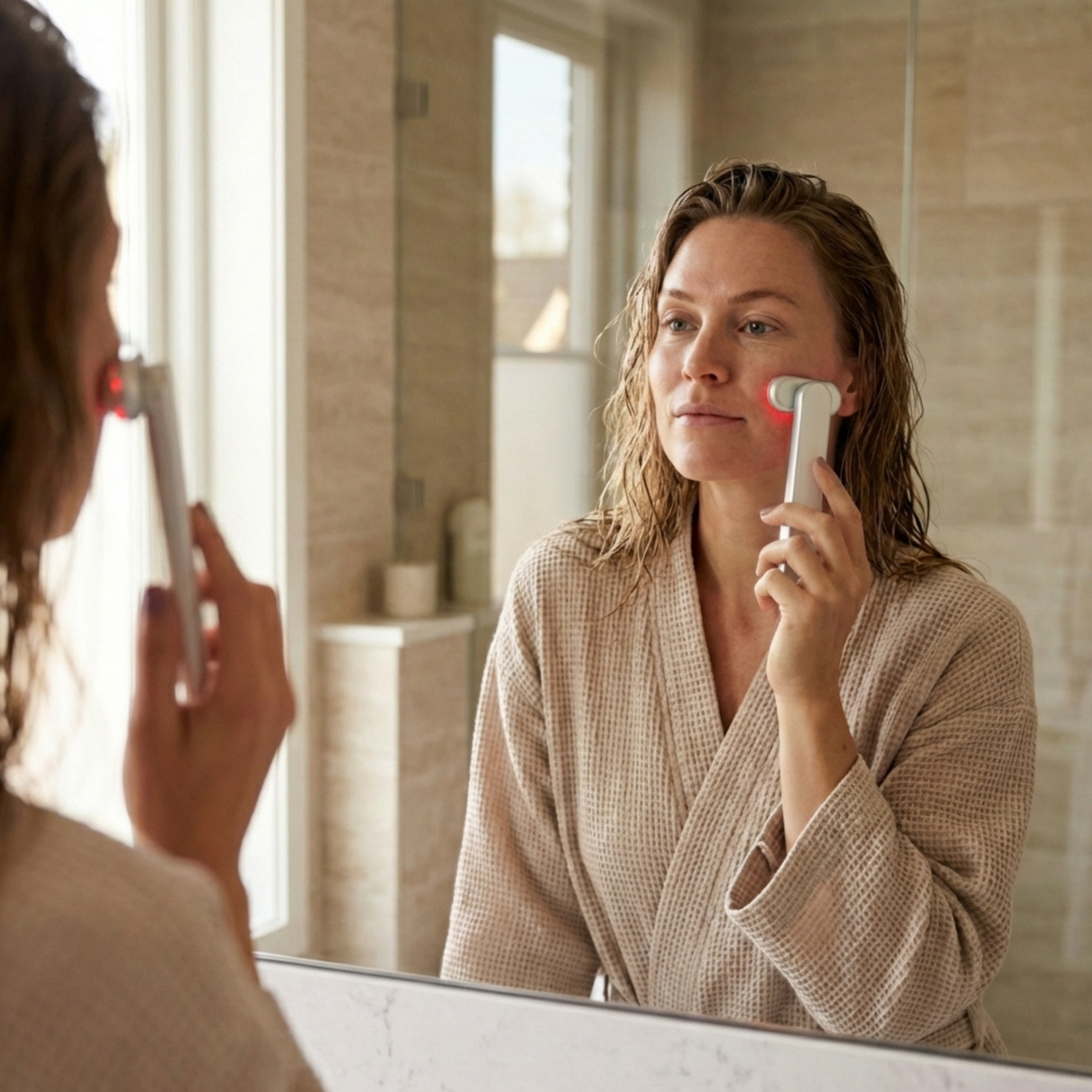 Rött ljus och NIR-ljus har visat sig stimulera kollagenproduktionen, vilket minskar synligheten av porer och gör huden jämnare och slätare. (Resultat kan ses inom 14–30 dagar).