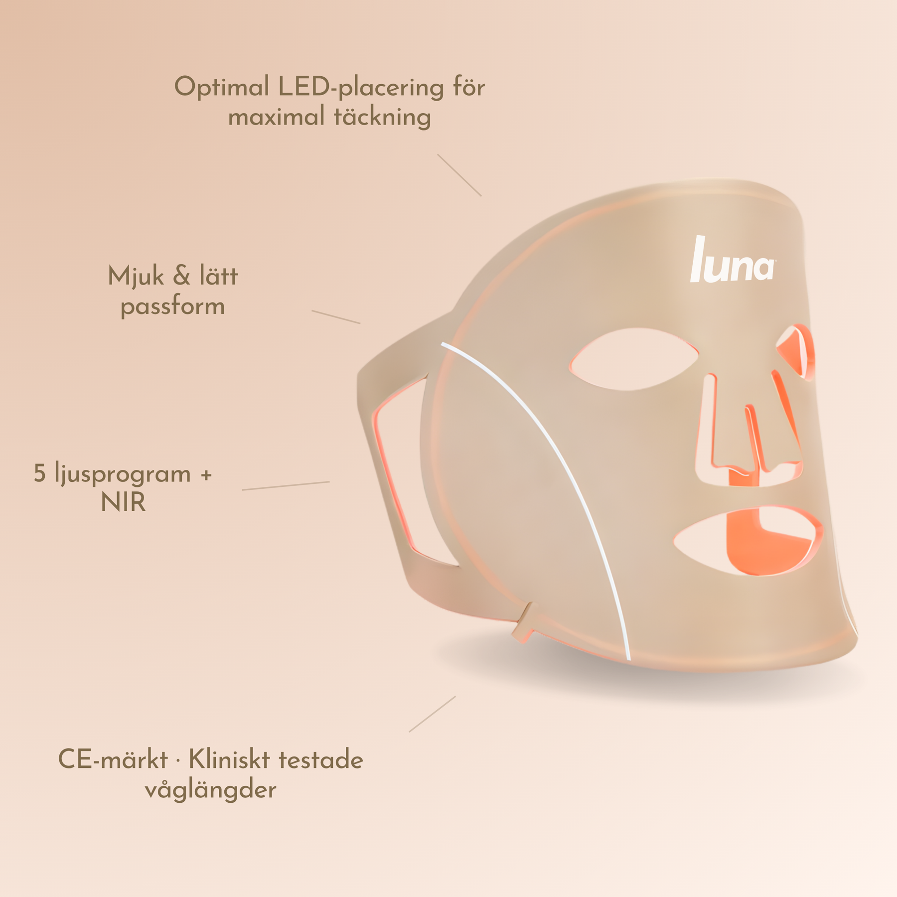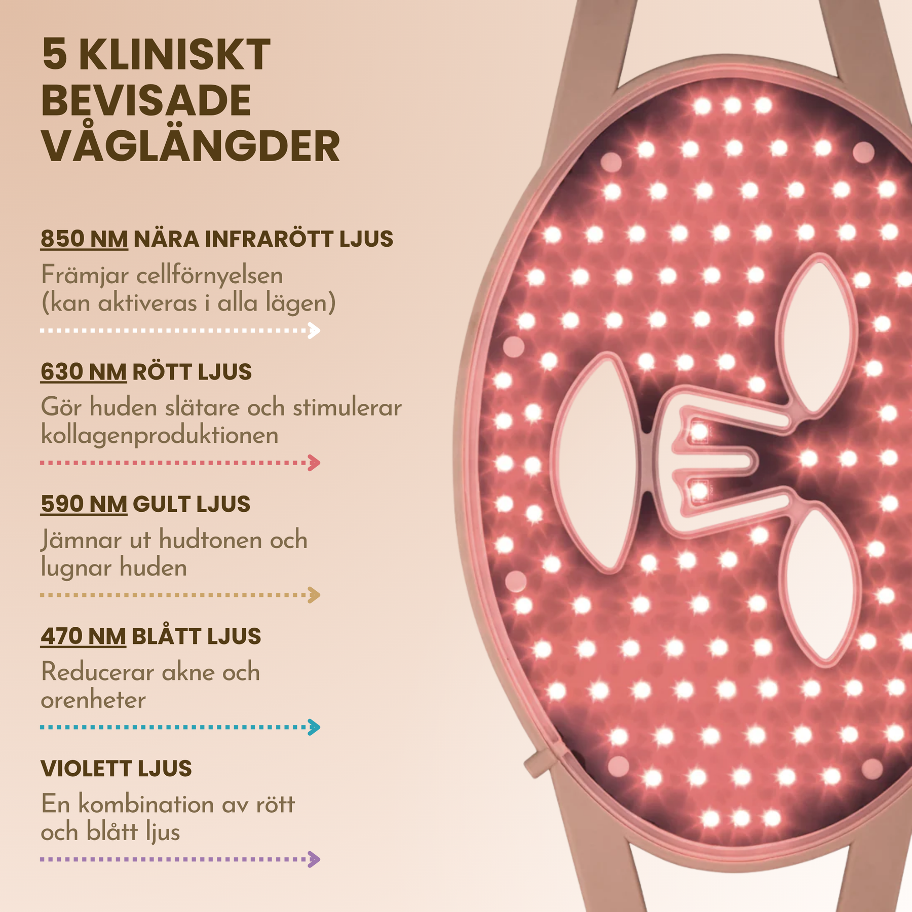 Nära infrarött ljus (850 nm): Tränger djupare ner i huden och stimulerar cellförnyelse, vilket ger en synlig uppstramning och förbättrad elasticitet.