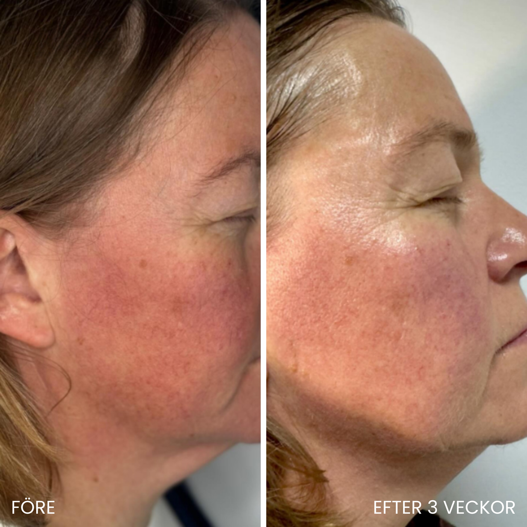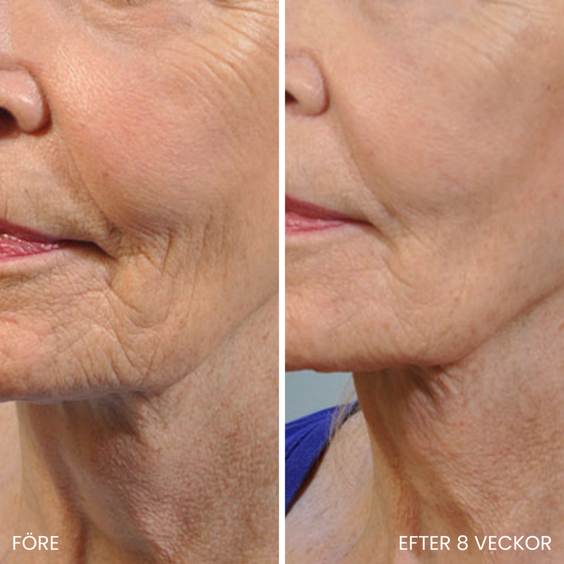 Rött ljus och NIR-ljus har lyft huden och stimulerat kollagenproduktionen, vilket gör huden slätare och fylligare. (Resultat kan ses inom 14–30 dagar).